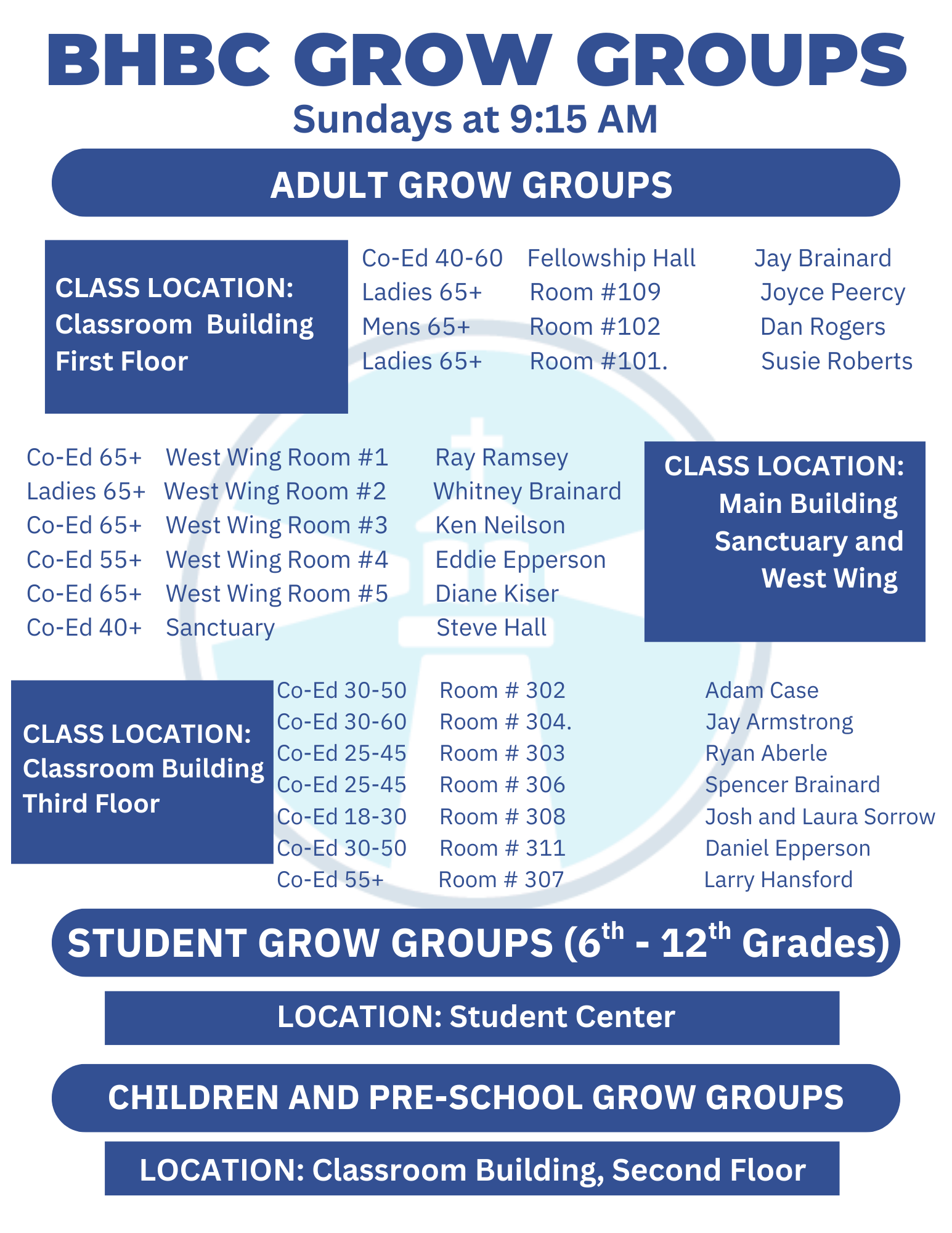 Our Grow Groups meet on Sundays at 9:15 AM.